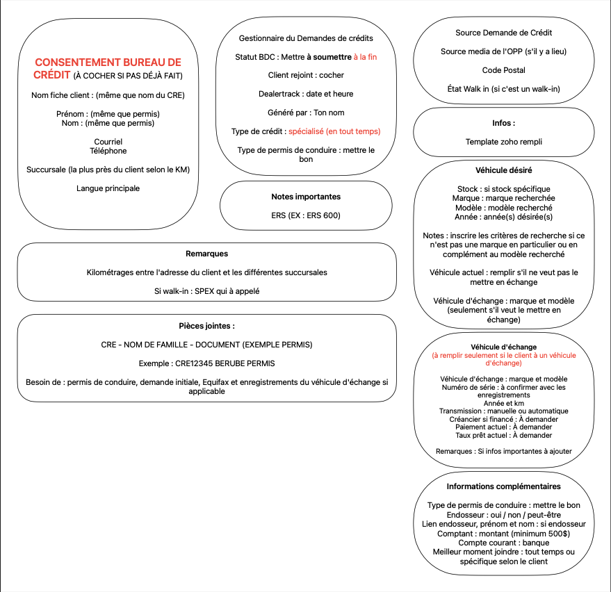 2 EMPLOIS **Mettre l’emploi principal dans Dealertrack et mettre les infos du 2e emploi seulement en notes dans Zoho. Noter l’emploi précédent dans Dealertrack.** RETARDS SUR DOSSIER DE CRÉDIT (R2 M3 I4 ETC..) Qu’est-ce qui se passe avec cela? ...